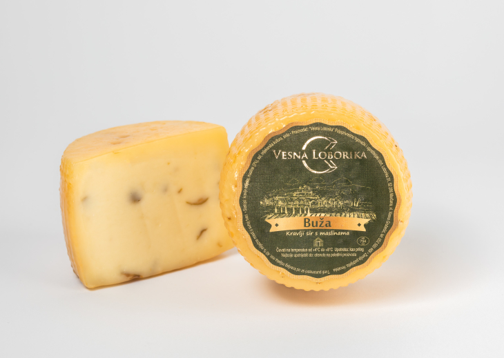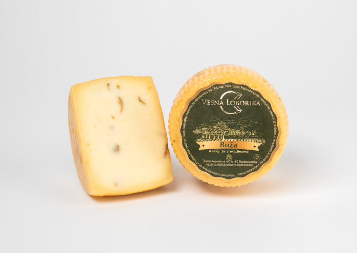 Kravlji sir s maslinama blagog je okusa uz notu kiselosti koju mu dodaju komadići maslina.