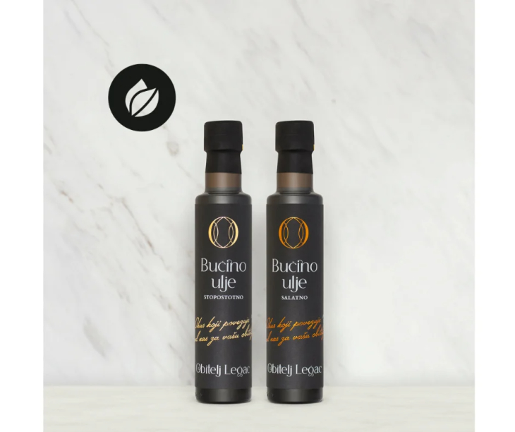 Sastav: Stopostotno bučino ulje (250ml) i Salatno bučino ulje (250ml)