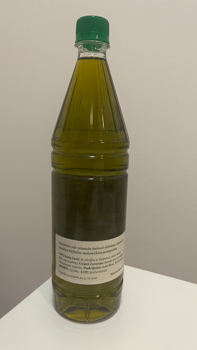 Masline su ručno brane i hladno prešane isti dan kako bi se sačuvala maksimalna kvaliteta, svježina i puna aroma. Ulje je bogatog okusa, s izraženim mirisom svježe masline – pravo domaće dalmatinsko ulje.