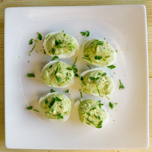 Indijske oraščiće kratko isjeckajte te stavite sa strane. U vodu, u kojoj se kuhaju jaja, dodajte malo soli i sode-bikarbone. Skuhajte jaja da budu tvrdo kuhana, ohladite, ogulite, izrežite uzdužno na polovice i izvadite žumanjke. U jednu posudu stavite skuhane žumanjke, "meso" od avokada, limunov sok, maslinovo ulje, sol i papar te sve izmiksajte. Na kraju dodajte isjeckane indijske oraščiće. Ispunite polutke bjelanjaka sa napravljenom smjesom i po želji dodajte začinsko bilje. Stavite u hladnjak na bar 30 minuta da se ohladi te uživajte! Dobar tek!