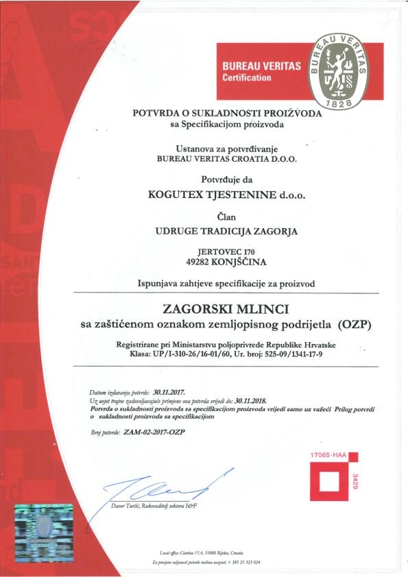 ''KOGUTEX Tjestenine '' d.o.o. proizvodi dvije vrste mlinaca, zagorski mlinci 500gr i rustikalni mlinci 500gr.
