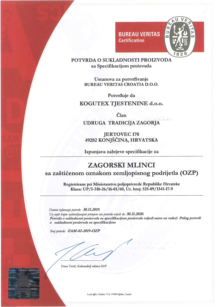 Mlinci se proizvode u pogonu proizvodnje koja ispunjava sve higijenske i zdravstvene norme, HACCP sustav samokontrole i sljedivosti, BV certifikat, oznaka ZOZP i znak Hrvatske kvalitete, samo su jamstvo našim potrošačima da kupuju provjeren i siguran proizvod, koji je rađen po strogoj proizvođačkoj specifikaciji, i dolazi iz određenog zemljopisnog područja. Pogon proizvodnje je u skladu sa svim propisima i normama za proizvodnju prehrambenih artikala, čemu svjedoče svi atesti i projekti, koji su bili potrebni da se proizvodnja vrši na siguran i zdrav način. Proizvodnja se odvija pod stalnim video nadzorom. Zagorski mlinci i Rustikalni mlinci mogu se upotrijebiti 12 mjeseci od datuma proizvodnje tj. do označenog datuma koji je otisnut na svakom pojedinačnom pakiranju, a kakvoća i kvaliteta mlinaca, a tako i sama analiza kiselinskog stupnja i postotak vlage, redovito se kontroliraju od strane Laboratorija za analitičku kemiju kod Instituta u Križevcima i Zavoda za javno zdravstvo u Zaboku.