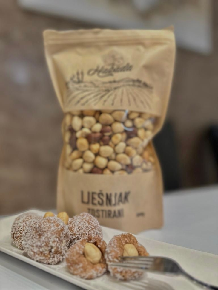 Domaći lješnjaci vrhunske kvalitete plod su obiteljskog truda i rada u nasadima lijeske na plodnoj slavonskoj crnici u đakovačkom kraju. Lješnjak tostirani dolazi u prigodnoj retro ambalaži s motivima Đakovačke katedrale i slavonskim poljem u pakiranjima od 100g, 250g, 500g i 1kg
